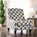This accent chair features a beautiful diamond floral pattern against an ivory fabric. This is a pleasing addition of color and pattern to a room, than can be combined with a small throw pillow and bright blanket.