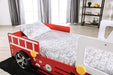 FIERSTALL Twin Bed, Red, 84 1/2"L X 47 1/4"W X 35 1/2"H, 126.76lbs. Keep the little ones inspired with this fire truck bed! On their way to save the day, this red and white twin bed will be the perfect ride! Molded front fascia, replicated stationary wheels, and topped with a cute, little siren